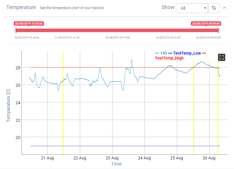 If the trackers have configured temperature alarms, the low limit and high limit of the alarm appears on Temperature trend.